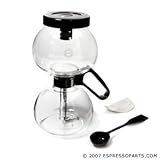 8 cup vacuum pot coffee brewer. The Yama Vacuum Brewer ships with one filter cloth, the filter assembly, a measuring spoon, lid/stand, and vacuum brewer. Additional filters are available for an additional charge. "Cup" refers to Yama's idea of what a cup should be and equals about 3-4 ounces for each cup. Directions for use: Use a slightly finer grind of coffee, somewhere around "auto drip" however you may experiment to taste. Drop the washable, reusable cloth covered filter into the infusion chamber with the chain hanging down into the glass syphon tube. Pull the chain down until you can hook it to the bottom of the siphon tube. Fill the bottom carafe to the 8 cup mark with hot water and place 8 measuring spoons of coffee mark in top chamber. Using the wire trivet between the coffee siphon and the burner place the coffee siphon on the burner and turn on to medium heat. DO NOT TURN THE BURNER ON HIGH As the water boils, it will be siphoned up to the top chamber where it will infuse with the ground coffee. A little water will always remain in the bottom water chamber. Let brew about 60 seconds, then remove the pot from the heat source. Once the coffee starts to cool the liquid is siphoned back down into the bottom carafe. Remove the top, placing it in its convertible lid/stand, and bring the pot to the table for serving. Gently rock the upper carafe back and forth until it can easily be removed and placed into it's stand. Serve and enjoy your fresh great tasting coffee. Although Isopropyl (Rubbing) Alcohol which is available at all drug stores can be used in the alcohol burner, Denatured Alcohol which can be purhcased most hardware stores will burn hotter and help heat the water quicker. Check out Old Timey ...Read more Details